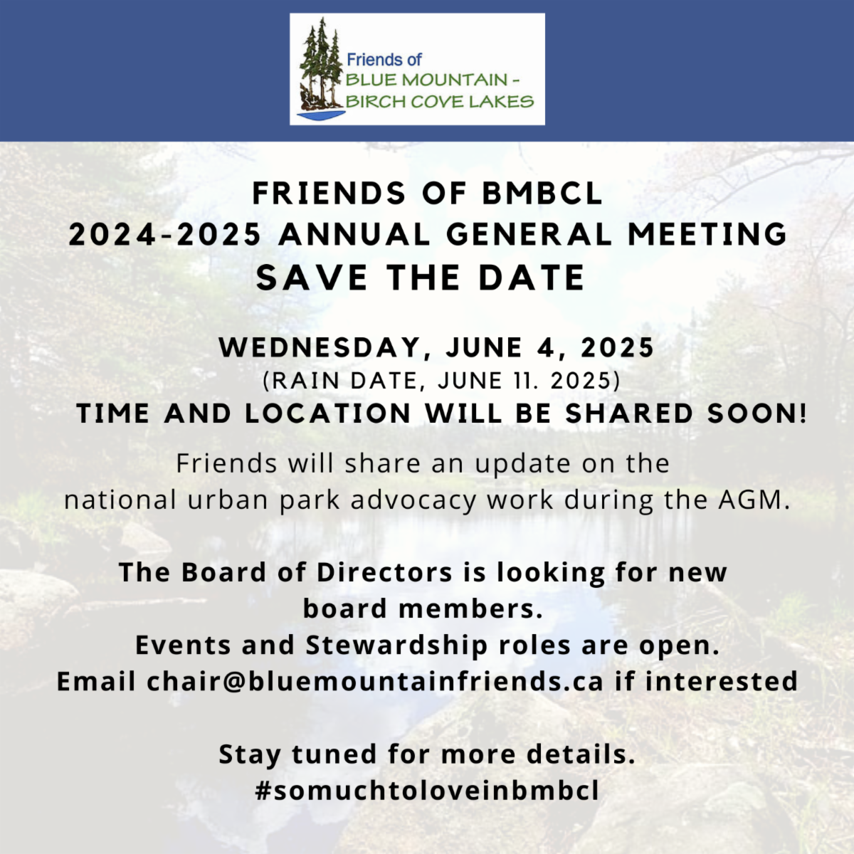 The Board of Directors is looking for new board members. Events and Stewardship roles are open. Email: chair@bluemountainfriends.ca if interested.