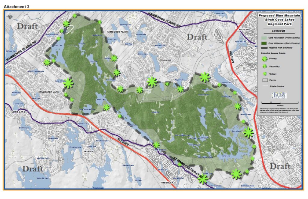A more fleshed-out park plan was taking shape with a large natural core area called the “back-country” (in dark green below) made up largely of the provincial protected lands, and a more intensive use “front country” area (in light green), which would act as a buffer for the interior core and where services and amenities would be located. The park concept was very well received by the public. Following the public meeting, a detailed Staff Report was prepared for HRM’s Environment Committee and Council, but it was never presented after a letter was sent to the City by the developer’s lawyers vaguely suggesting legal action. After that, key City staff were removed from the file and all planning work on the park ceased.