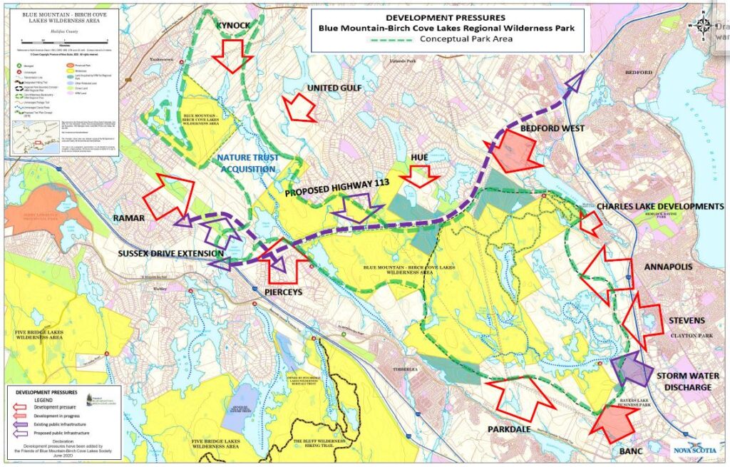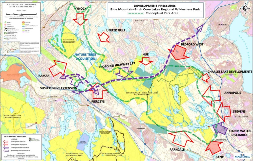 In 2013 HRM sold 88 acres at the southern corner of the Blue Mountain – Birch Cove Lakes (BMBCL) Regional Park to a private developer (BANC Commercial Holdings Limited). From the perspective of the Friends of BMBCL Society, this sale, adjacent to the retail properties on Chain Lake Drive in Bayers Lake Business Park, was extremely unfortunate. The subject property was the only land owned by HRM within or immediately adjacent to the proposed regional park and its sale and pending development for commercial and institutional purposes directly conflicts with the intent of the Muncipality’s 2006 Regional Plan and the 2014 plan update.