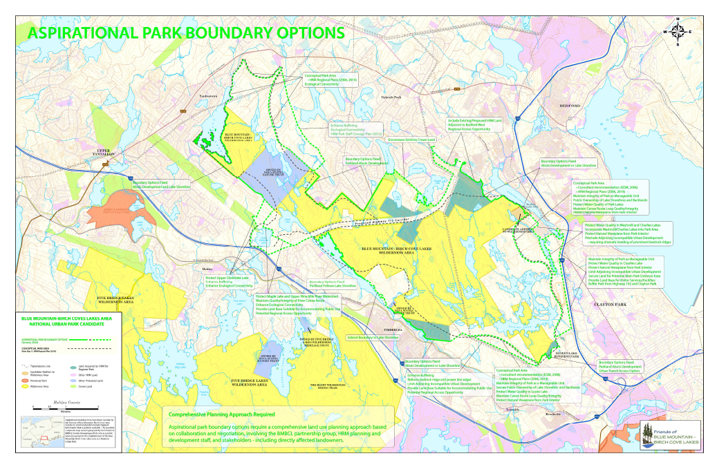 In August 2021, a statement of collaboration was signed between Halifax Regional Municipality and Parks Canada National Urban Parks Program to create a National Urban Park. Blue Mountain-Birch Cove Lakes is one of four sites shortlisted across Canada for this designation.