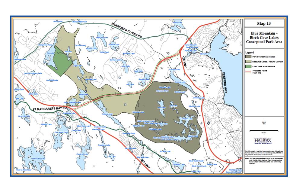 The Regional Plan presented a detailed map of the intended park (Map 13 and later, Map 11 in the five year review) showing the western boundary located along a natural ridgeline and encircling the Birch Cove Lakes. The area is made up of a combination of Provincial Crown land and privately owned land. None of these lands have development rights. They are zoned “urban Reserve” and are not to be considered for development during the 25-year Regional Plan (if ever). The Regional plan commits to acquiring the “necessary private lands” for the park (as shown on Map 11) and lists a number of methods for acquisition.